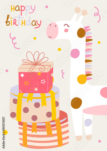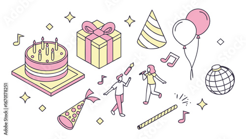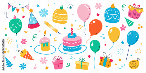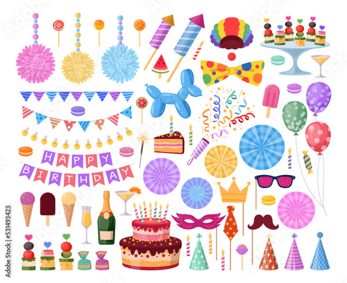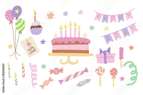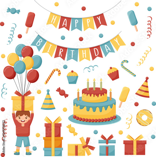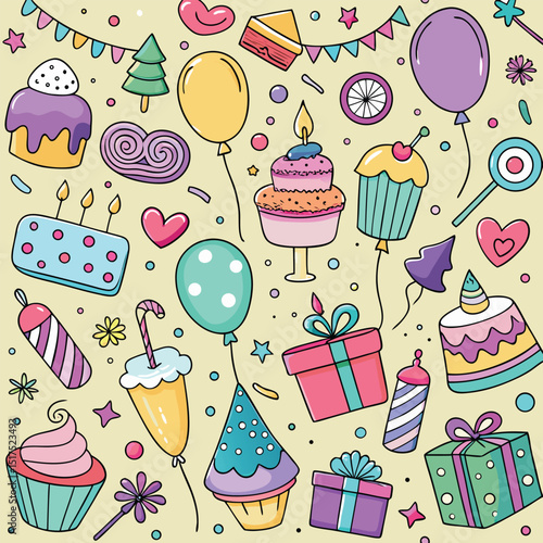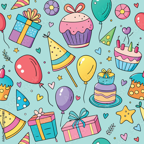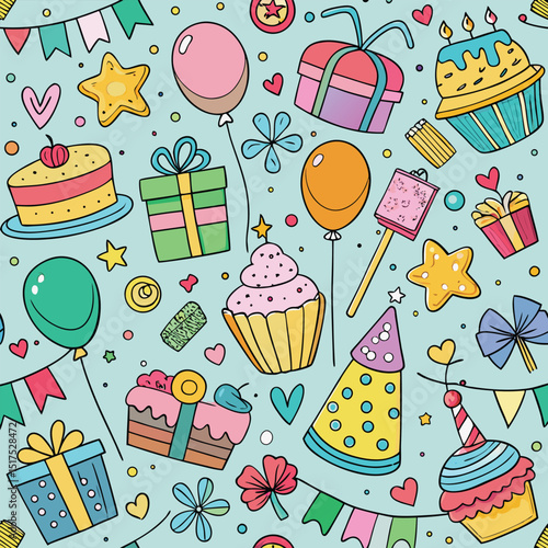 Vektorové bezešvé vzor s Party dekorace. Narozeninový dort, sladkosti, dárkové krabičky, balónky a párty vlajky. Všechno nejlepší k narozeninám pozadí, tapety, látky, balicí papír.