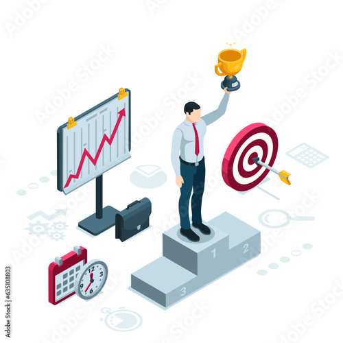Šťastný podnikatel drží dolarovou minci ve zvednutých rukou stojících na sloupcovém grafu nahoře, ploché vektorové izometrické ilustrace. Úspěšný investor slaví finanční úspěch.