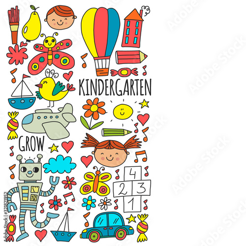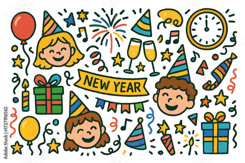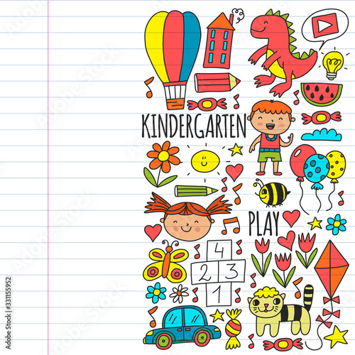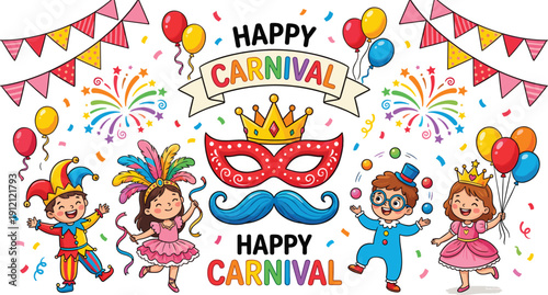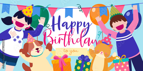 Šťastné děti party plakát design šablony vektorové ilustrace. Veselé děti drží pozvánku na zábavu čas oslavy