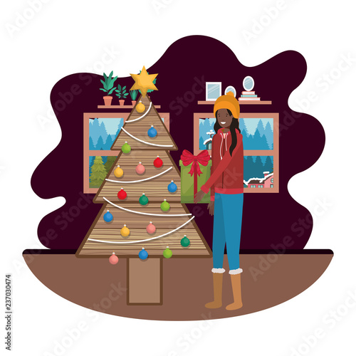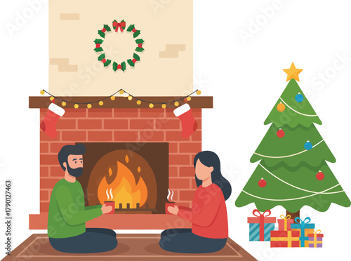 Šťastný pár slaví novoroční noc, vánoční svátky společně doma, ploché vektorové ilustrace. Interiér obývacího pokoje s zdobeným krbem, vánoční stromeček. Romantická noc u krbu.