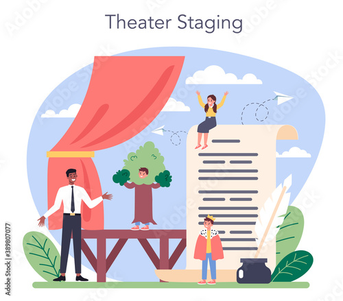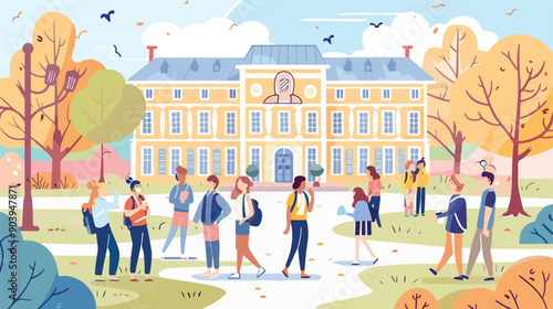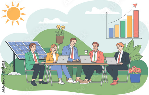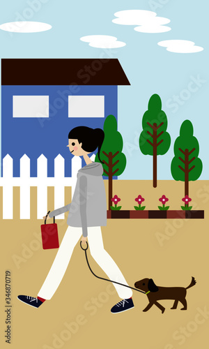 Šťastný pár s bbq party v zahradě, ploché vektorové ilustrace. Mladý muž grilování bbq maso, žena hraje s pet pes sedí na židli pod deštníkem. Letní venkovní piknik, grilování.