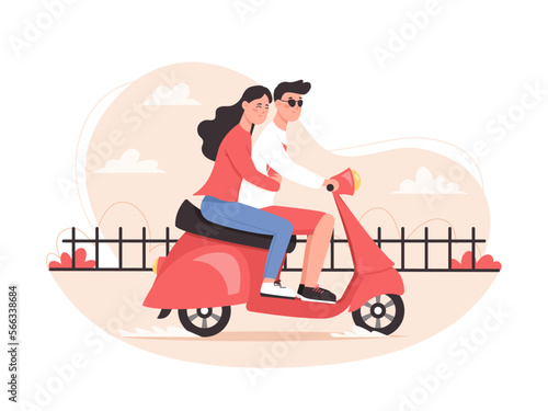 Šťastný pár v lásce na koni skútr, ploché vektorové ilustrace. Letní prázdniny, romantická dovolená, líbánky.