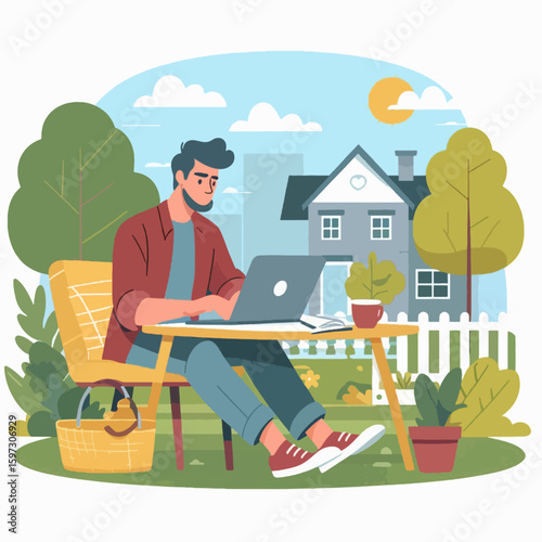 Šťastný pár ve VR brýlích s virtuální venkovní piknik, zatímco sedí v křeslech doma, ploché vektorové izolované ilustrace. Datum virtuální reality.