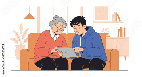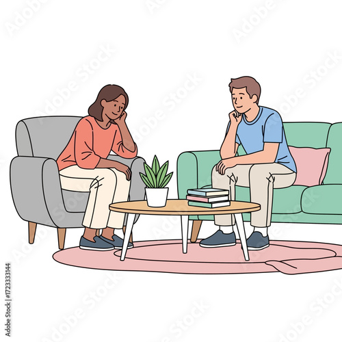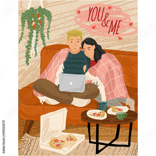 Šťastný pár sedí a objímají se. Dovolená vektorové ilustrace. Romantický pár relaxační a užívat si vánoční náladu doma. Muž a žena sedí na pohovce pod přehoz a sledování filmu.