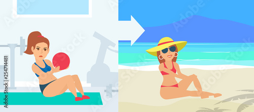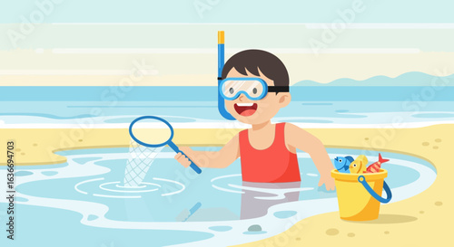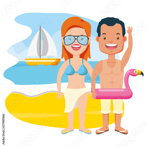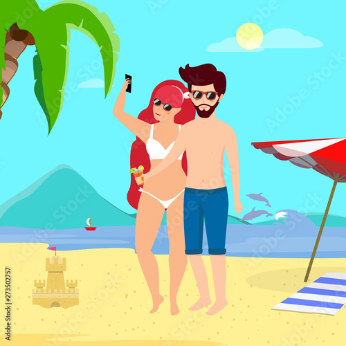 Šťastný pár při selfie na pláži, ploché vektorové ilustrace. Letní dovolená, dovolená na pláži, romantický výlet, cestování.