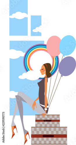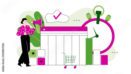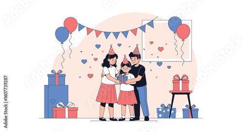 Pár čeká na holčičku, ploché vektorové ilustrace. Šťastná těhotná žena, manžel otevření dárková krabička s modrými balónky, buben s růžovým kouřem, velký dort. Dítě pohlaví odhalit oznámení strana.