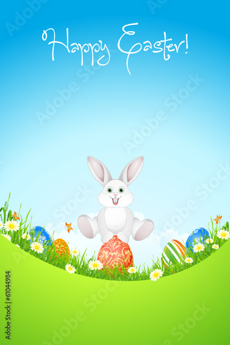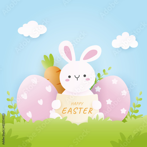 Veselé Velikonoce plakát banner šablona, vektorové ilustrace ve stylu řezu papíru. Roztomilý králík sedí v trávě a velikonoční vajíčka.