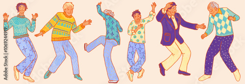 Šťastný Starší pár tančí zábavný tanec s radostí a potěšením s romantickým seznamováním izolované vektorové ilustrace na bílém pozadí. Milostný vztah starých lidí