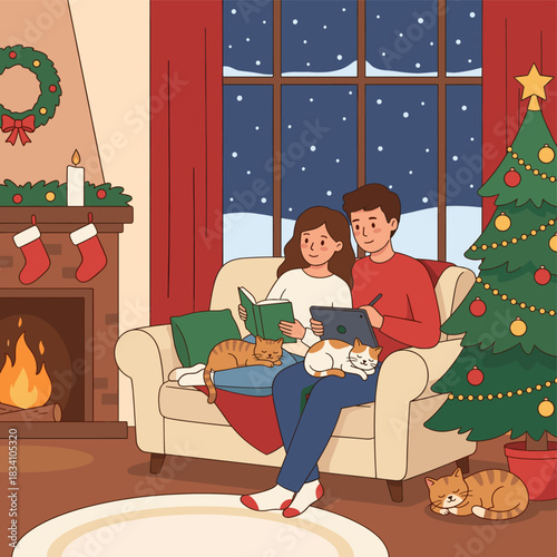 Šťastná rodina slaví Vánoce a Nový rok doma vektorové ilustrace. Milující rodiče dávají dárkové krabičce své rozkošné dceři dítě, zatímco sedí na podlaze obývacího pokoje