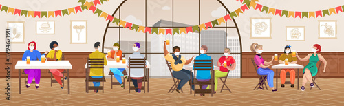 Šťastná rodina slaví Nový rok noc doma, ploché vektorové ilustrace. Interiér obývacího pokoje s zdobeným vánočním stromkem, krb s vánočními ponožkami. Santa Claus dává dárky dětem.