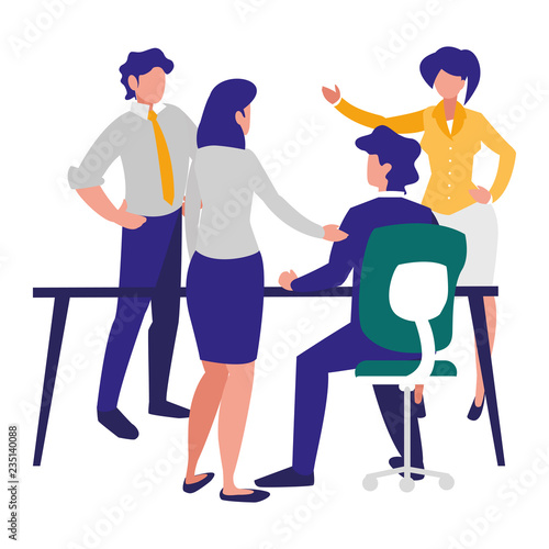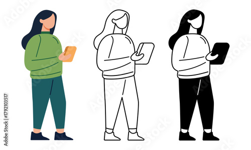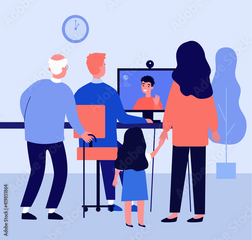 Šťastné rodinné postavy s dětmi plánování travle, zatímco sedí u počítače vektorové ikony izolovaných na bílém pozadí.