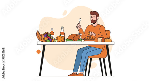Šťastná rodina snídá doma v kuchyni. Moderní kuchyně interiér ručně kreslené vektorové ilustrace. Varná plocha s jídelním stolem ve skandinávském kresleném stylu. Útulný design hygge.
