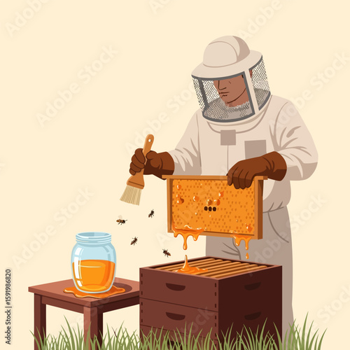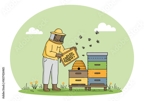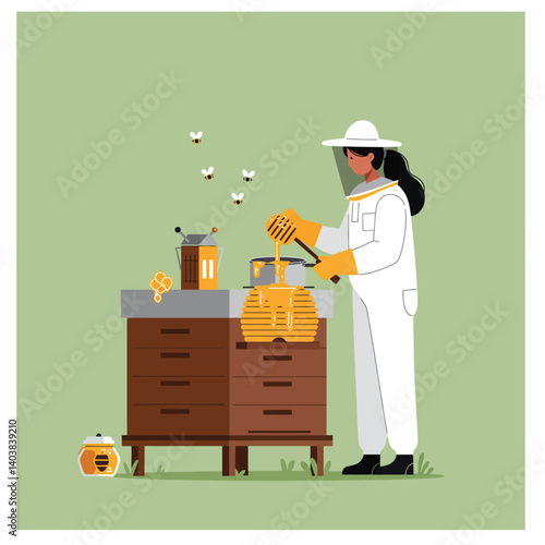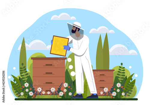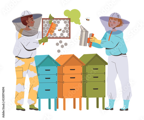 Šťastná rodina včelaře v uniformě pracuje na včelí farmě scény. Muž a žena hiver pár zabývající se přírodní organické medu výrobní proces vektorové ilustrace
