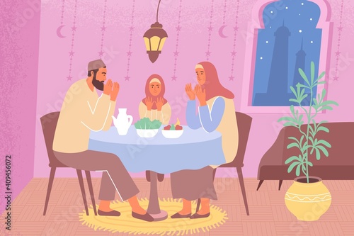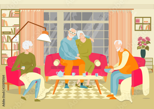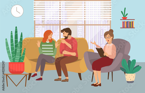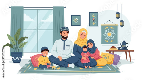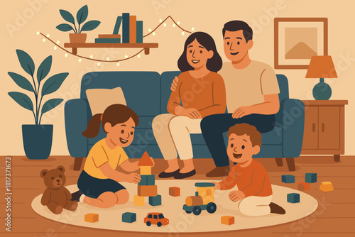 Šťastná rodina hraje deskovou hru společně sedí na podlaze v obývacím pokoji, ploché vektorové ilustrace. Rodiče s dětmi se těší volnému času s hraním stolní hry doma. Příbuzenství.