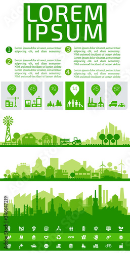 Šťastná rodina vektorové webové stránky šablony, webové stránky a vstupní stránky design pro webové stránky a mobilní vývoj webu. Papír broušený zeleně s bílým ekologickým městem a rodinou se dvěma dětskými siluetami.