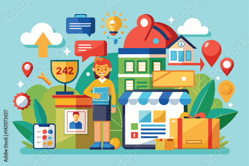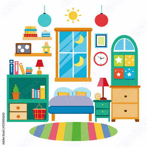Vektorová ilustrace šťastného rodinného otce, matky se dvěma syny sledujícími televizi. Interiér obývacího pokoje. Plochý design.