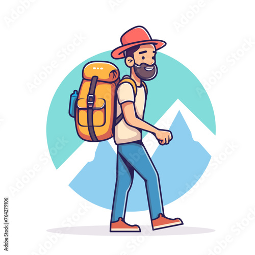 Šťastný otec a syn jít pěší turistiku společně, ploché vektorové ilustrace. Rodinné postavy trekking, cestování s batohy. Vztah rodičů a dětí, šťastné otcovství a rodičovství. Aktivita.