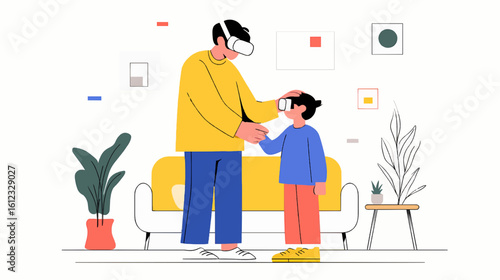 Šťastný otec a syn si spolu hrají s letadlovou hračkou, ploché vektorové ilustrace. Táta s dítětem tráví čas společně. Vztah rodičů a dětí, šťastné otcovství a rodičovství.