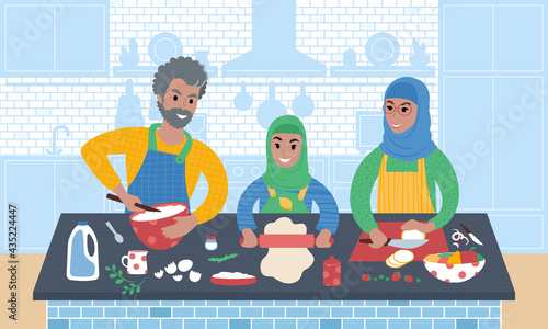 Šťastný otec vaření palačinky s dcerou v kuchyni, ploché vektorové ilustrace. Táta s dítětem tráví čas společně přípravou snídaně. Vztah rodičů a dětí, šťastné otcovství a rodičovství.