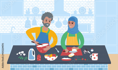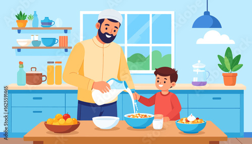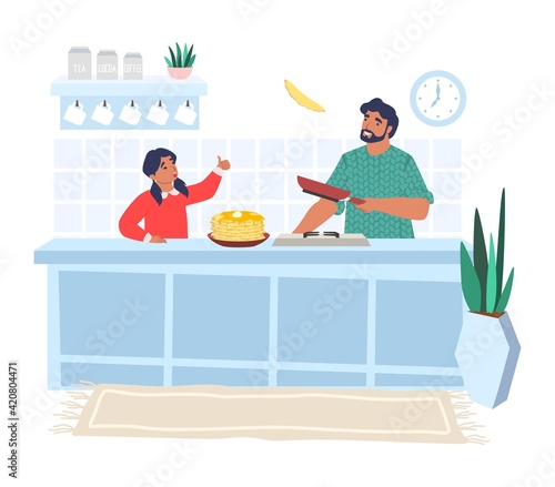 Šťastný otec vaření palačinky s dcerou v kuchyni, ploché vektorové ilustrace. Táta s dítětem tráví čas společně přípravou snídaně. Vztah rodičů a dětí, šťastné otcovství a rodičovství.