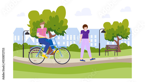Šťastné ženské postavy jezdící na kole a běžící v městském parku, vektorová plochá ilustrace. Aktivní a zdravý životní styl, cyklistika, sportovní trénink.