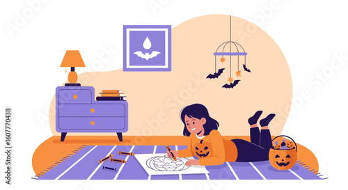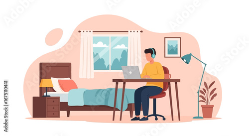 Šťastná dívka, na volné noze pracuje na přenosném počítači z domova ležící na útulné pohovce, ploché vektorové ilustrace. Na volné noze, práce na dálku, home office.