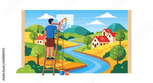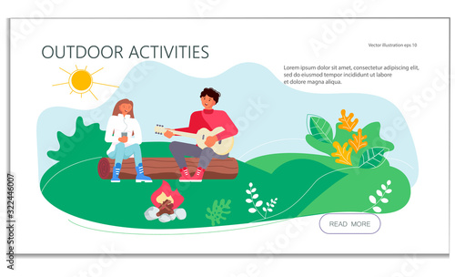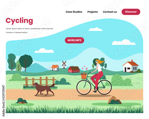 Šťastná dívka na kole na venkovské silnici. Venkovní přírodní krajina. Venkovská farma. Žena na kole. Vektorové webové stránky design šablony. Ilustrace konceptu webové stránky vstupní stránky