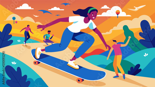 Šťastná Přítelkyně a Přítel teenager postavy skateboarding jízda dolů na dálnici scény. Bederní mládež pár freestyling stravování venkovní vektorové ilustrace