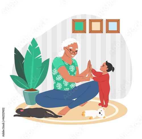 Šťastná babička hraje s vnučkou sedí na koberci, ploché vektorové ilustrace. Babička a vnouče tráví čas společně. Vztahy prarodičů a vnoučat.