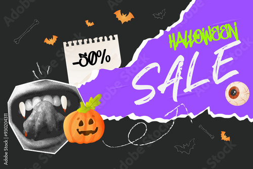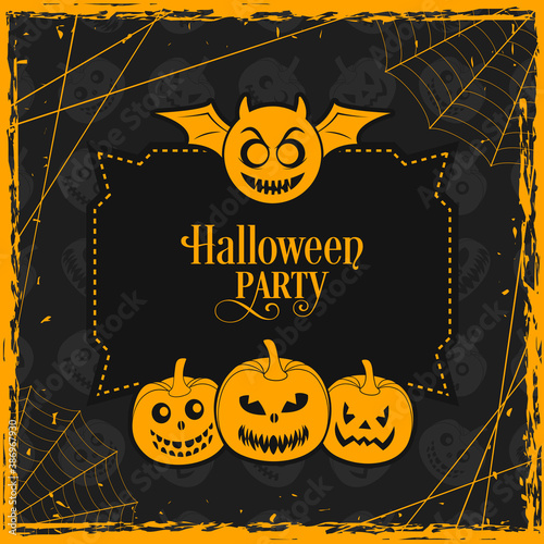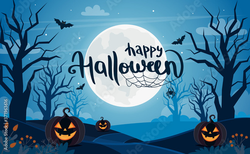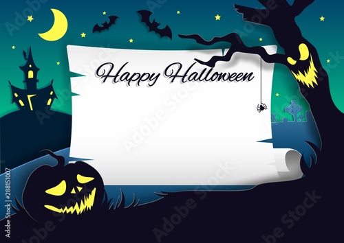 Happy Halloween Party Pozvánka, Vektorové ilustrace v papírovém uměleckém stylu. Noční pozadí s půlměsícem, děsivou dýní, strašidelným domem, létajícími netopýry, hřbitovem s hroby a mrtvým stromem.