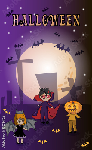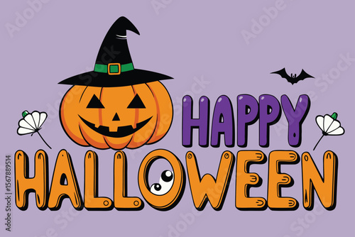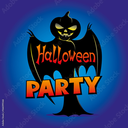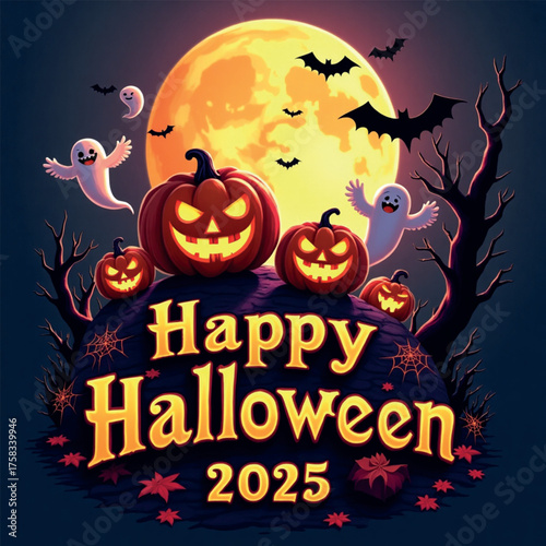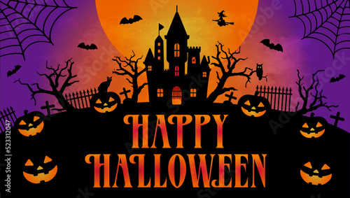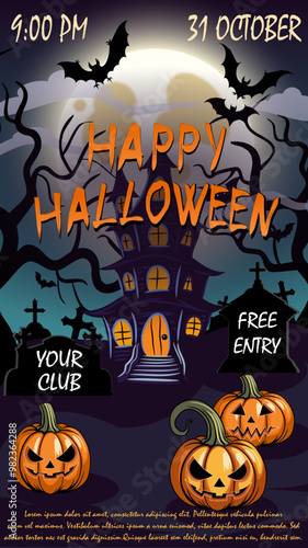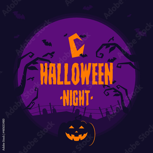 Happy Halloween plakát šablona, vektorové ilustrace v papírové umění stylu. Oranžové strašidelné dýně, černý mrtvý strom, létající netopýři, strašidelný dům a úplný bílý měsíc.