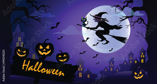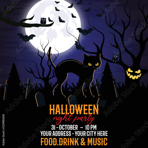 Happy Halloween plakát šablona, vektorové ilustrace v papírové umění stylu. Halloween tradiční symboly úplněk, strašidelné dýně, strašidelný dům, létající netopýři, hřbitov s hroby, mrtvý strom.