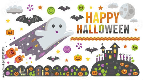 Halloween vektorové banner ploché vstupní stránka. Pozadí strany. Šťastní lidé ve slavnostním kostýmu slaví strašidelné říjnové noční události. Podzimní sezóna dovolená oslava