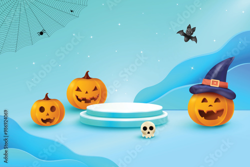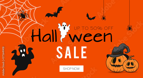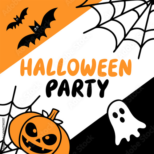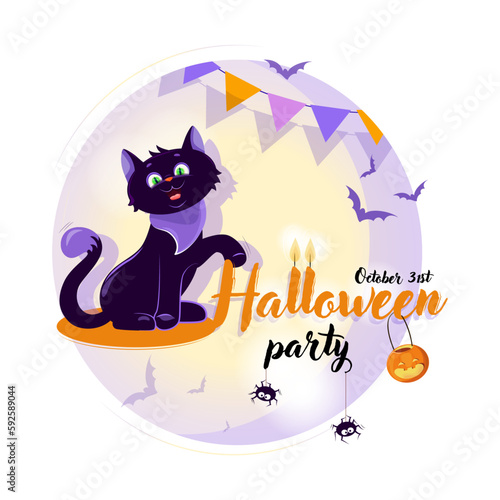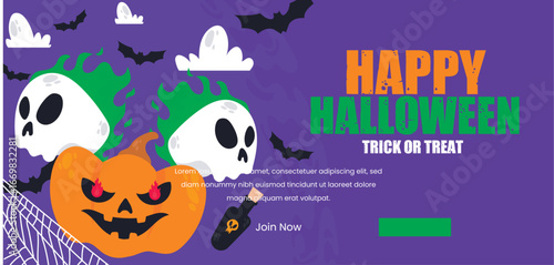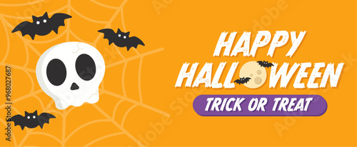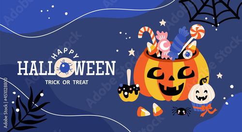 Šťastný Halloween vektorové ploché ilustrace. Černý pavouk, dýně, lidská lebka, nůž, netopýři, cukroví kuří oka a čarodějnice klobouk. Koncept Halloween party pro pozvánku, plakát, webový banner, webovou stránku atd.