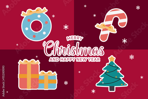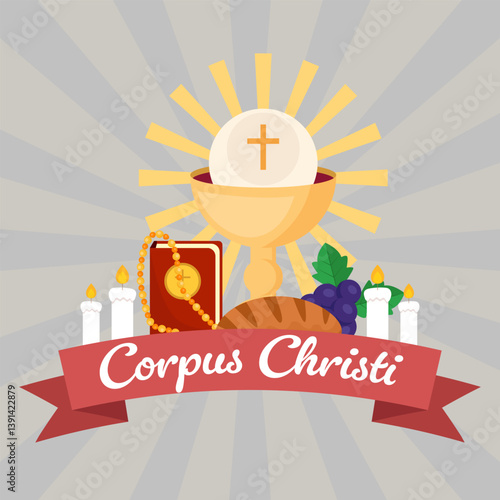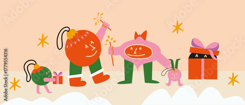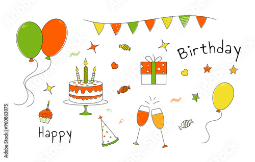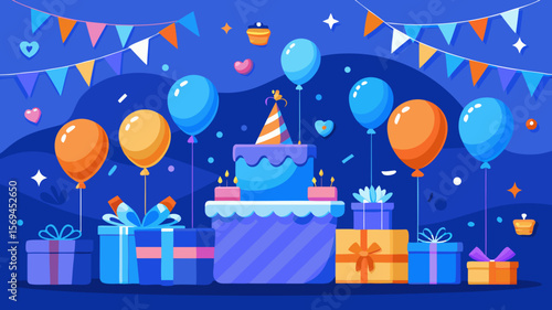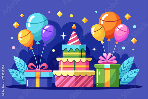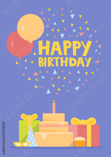 Šťastné svátky vektorové ploché ilustrace. Sváteční dort s hořícími svíčkami, balónky ve tvaru srdce, dárková krabička, jablko, banán, nápisy lásky. Blahopřání, oslava plakát, banner.