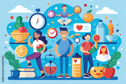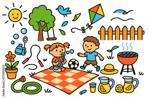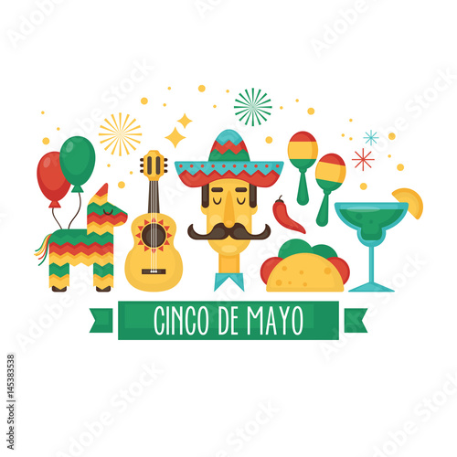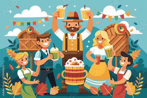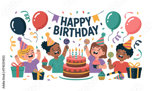 Šťastné svátky vektorové ploché ilustrace. Ruce držící láhev mléka s bradavkou, narozeninový dort s číslem jedna, medvídek, párty klobouky, balónky, dárková krabička. Blahopřání, oslava plakát, banner