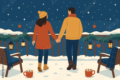 Šťastný milující pár slaví Vánoce a Nový rok sedí u stolu s slavnostní večeře a nápoje doma vektorové ilustrace. Romantický večer během zimních prázdnin koncept