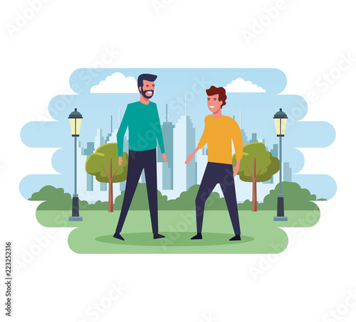 Šťastný muž přátelé usmíření handshake gesto plochý vektor. Mladý interracial muž stojící na mostě na obou stranách trhliny ilustrace. Multietnické přátelství, komunikace a důvěra