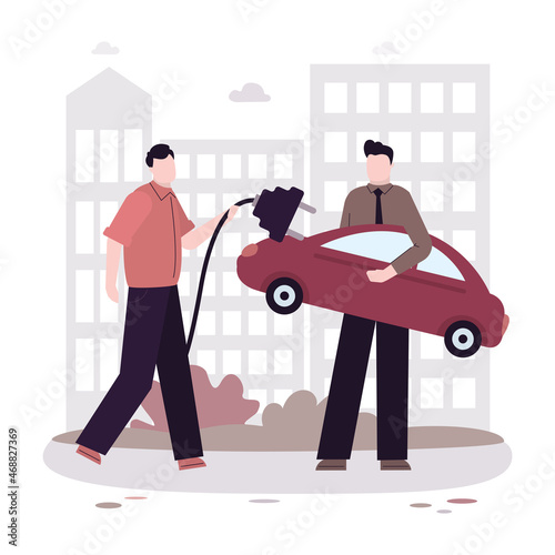 Šťastný muž a jeho auto, ploché vektorové ilustrace. Majitel auta a řidič mužské postavy upevnění, mytí jeho auto s vodní hadicí. Koncept lidí a aut.
