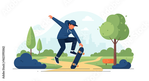 Šťastný muž na koni gyroskop, ploché vektorové ilustrace. Ekologická městská doprava. Aktivní životní styl. Urban self balancing board elektrický skútr, hoverboard.