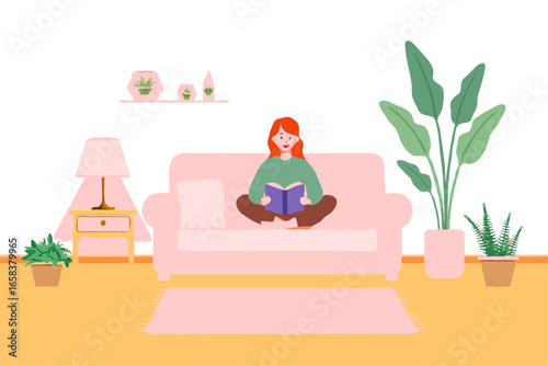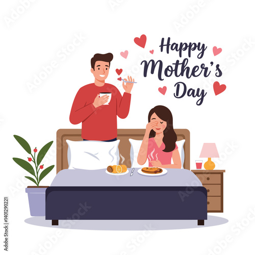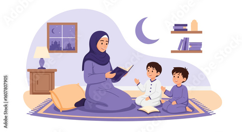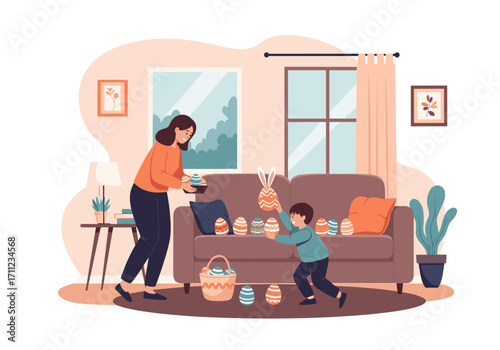 Šťastná matka vrací domů z práce, roztomilé děti čekají na ni sedí na pohovce v obývacím pokoji, ploché vektorové ilustrace. Interiér. Šťastný rodinný vztah. Návrat.