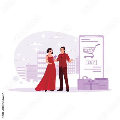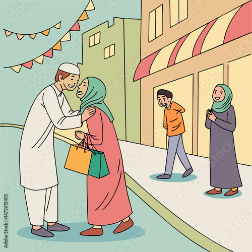 Šťastná Muslimská dívka nakupování v obchodě s oblečením pro ženy, ploché vektorové ilustrace. Mladá arabská žena, která nosí tradiční oblečení a hidžáb, si vybírá moderní šaty s prodavačkou v módním butiku.