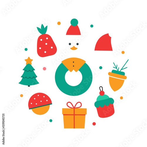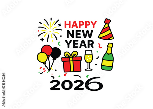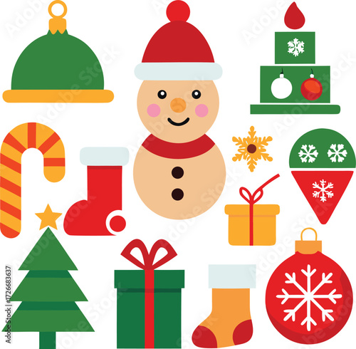 Šťastný Nový Rok vektorový plochý styl designu ilustrace. Santa klobouk, dárkové krabičky, sklenice mléka s cookies, cukrová třtina, vánoční stromek, koule. Složení zimní dovolené pro webový banner, webovou stránku atd