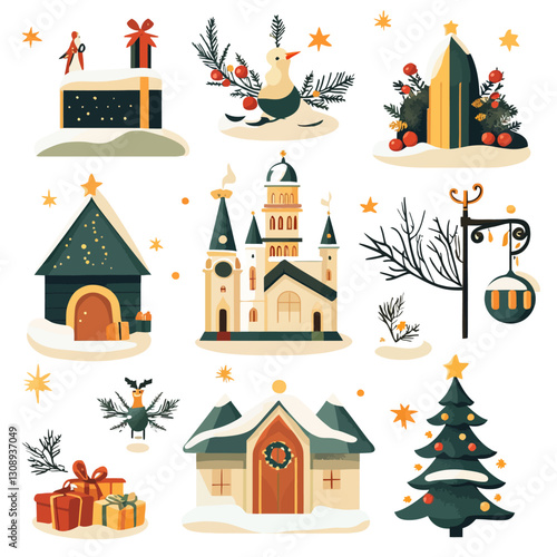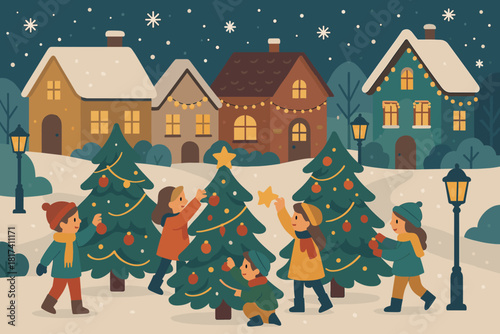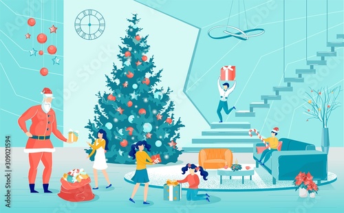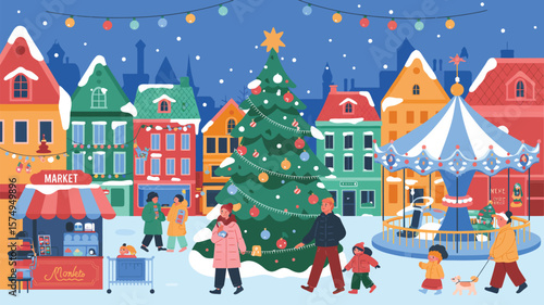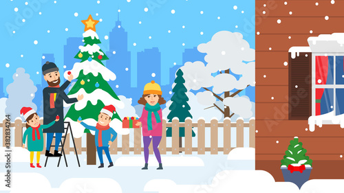 Dav šťastných lidí postavy bruslení na kluziště Vánoce během městské outdoorové aktivity na zimní prázdniny dovolená vektorové ilustrace. Městská krajina a aktivní muž, žena, rodič a děti