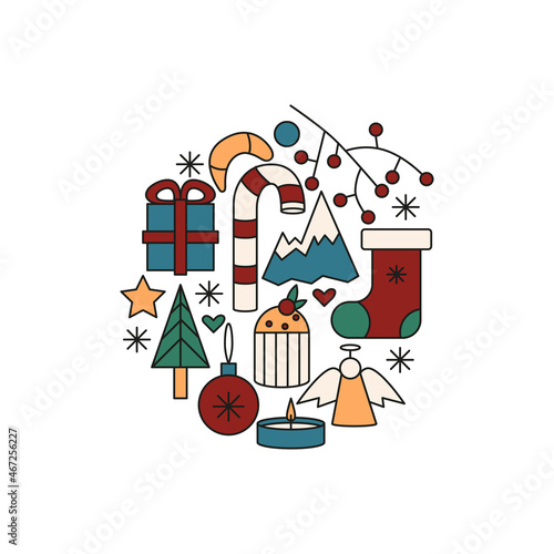 Drobné mužské a ženské postavy připravují tradiční vánoční dárky, ploché vektorové ilustrace. Šťastní lidé balí dárkové krabičky, perníkové sušenky, cukrovou třtinu do obří vánoční ponožky.