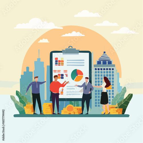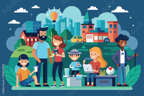 Šťastní lidé odpočívají v městském parku, plochá vektorová ilustrace. Mužské a ženské postavy mají piknik, jíst grilované maso a pouliční jídlo. Bbq párty, letní tábor, víkend, venkovní volný čas.