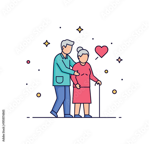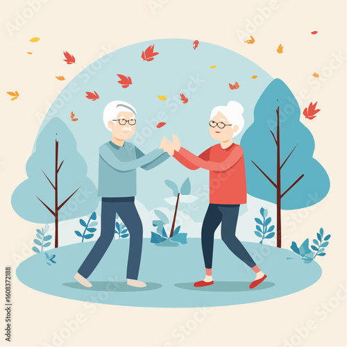 Romantické Starší pár vektorové ploché ilustrace. Šťastný starší muž a žena spolu mluví na ulici. Koncept lidských vztahů.