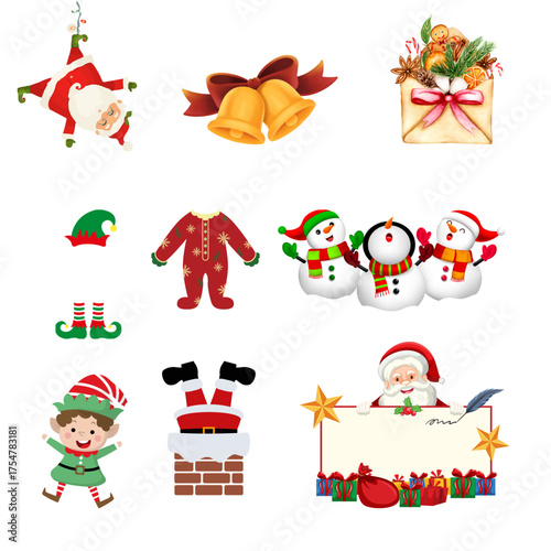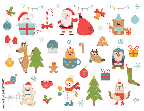 Veselé Vánoce set, ploché vektorové izolované ilustrace. Šťastný Santa Claus a roztomilý vůl, znamení čínského zvěrokruhu 2021 s dárky, vánoční stromeček, koule, věnec, zvonek. Šťastný Nový rok oslava.
