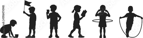 Šťastný sportovní děti hrají tenis, fotbal, basketbal hry, dělá fyzické cvičení, švihadlo, spinning hula-hoop barevné silueta izolované vektorové ilustrace nastavit na bílém pozadí