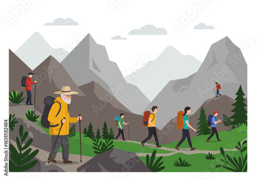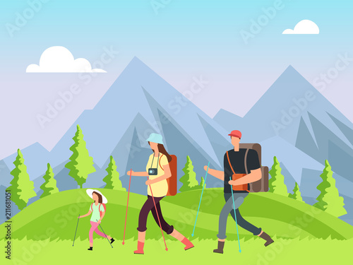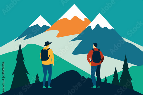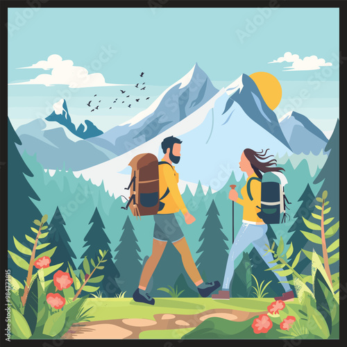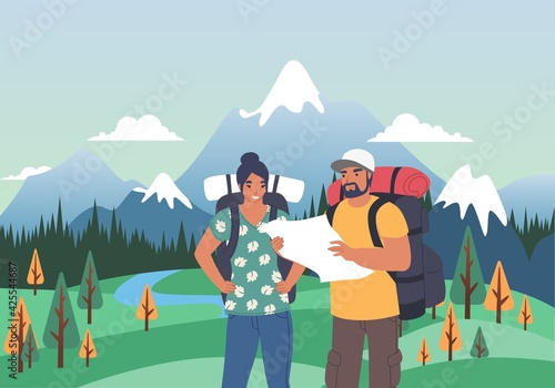 Šťastný turistický pár s batohy při pohledu na mapu, ploché vektorové ilustrace. Letní turistika, turistika, trekking, outdoorové aktivity.